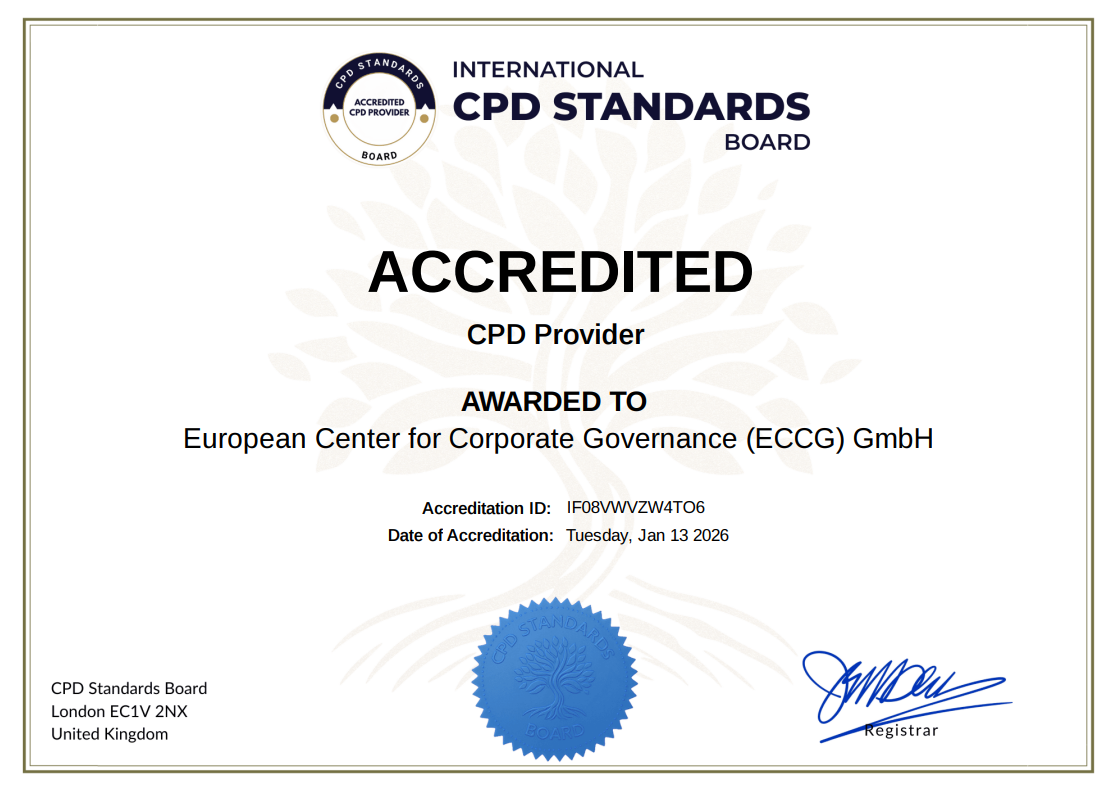 CPD accreditation certificate awarded to the European Center for Corporate Governance, demonstrating compliance with professional development standards
